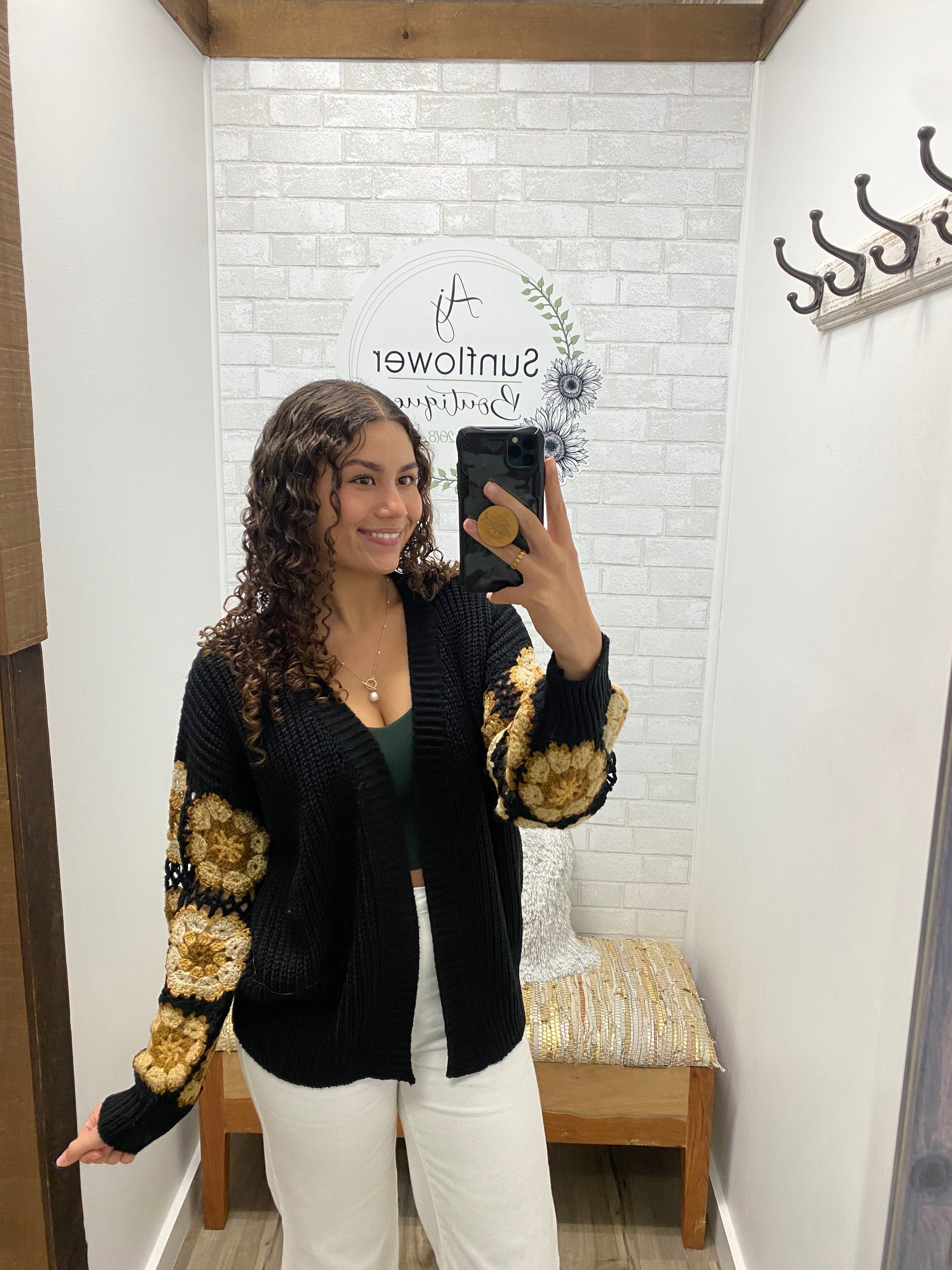 This cardigan is such a fun winter layer. The black knit keeps it classic, but the floral sleeves give it that cozy, seasonal touch that makes it special. It’s warm, easy to throw on, and looks great with denim or leggings.