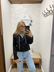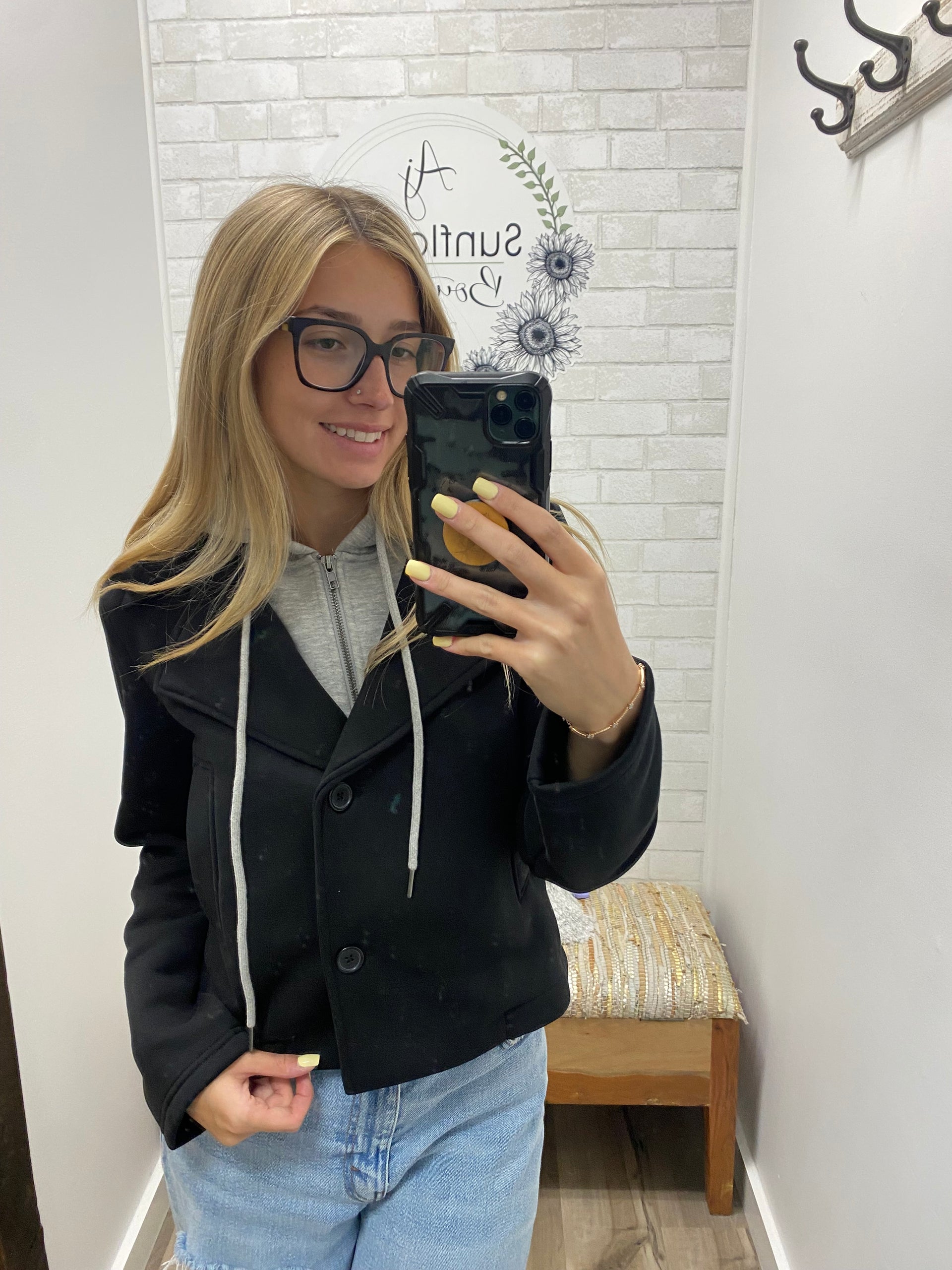 A cozy twist on a classic. This cropped black blazer is lined with a soft heather grey hoodie insert, giving you the warmth of a sweatshirt with the polish of a jacket. Easy to dress up or down, it’s the perfect grab-and-go layer for everything from weekend outings to casual nights in town.