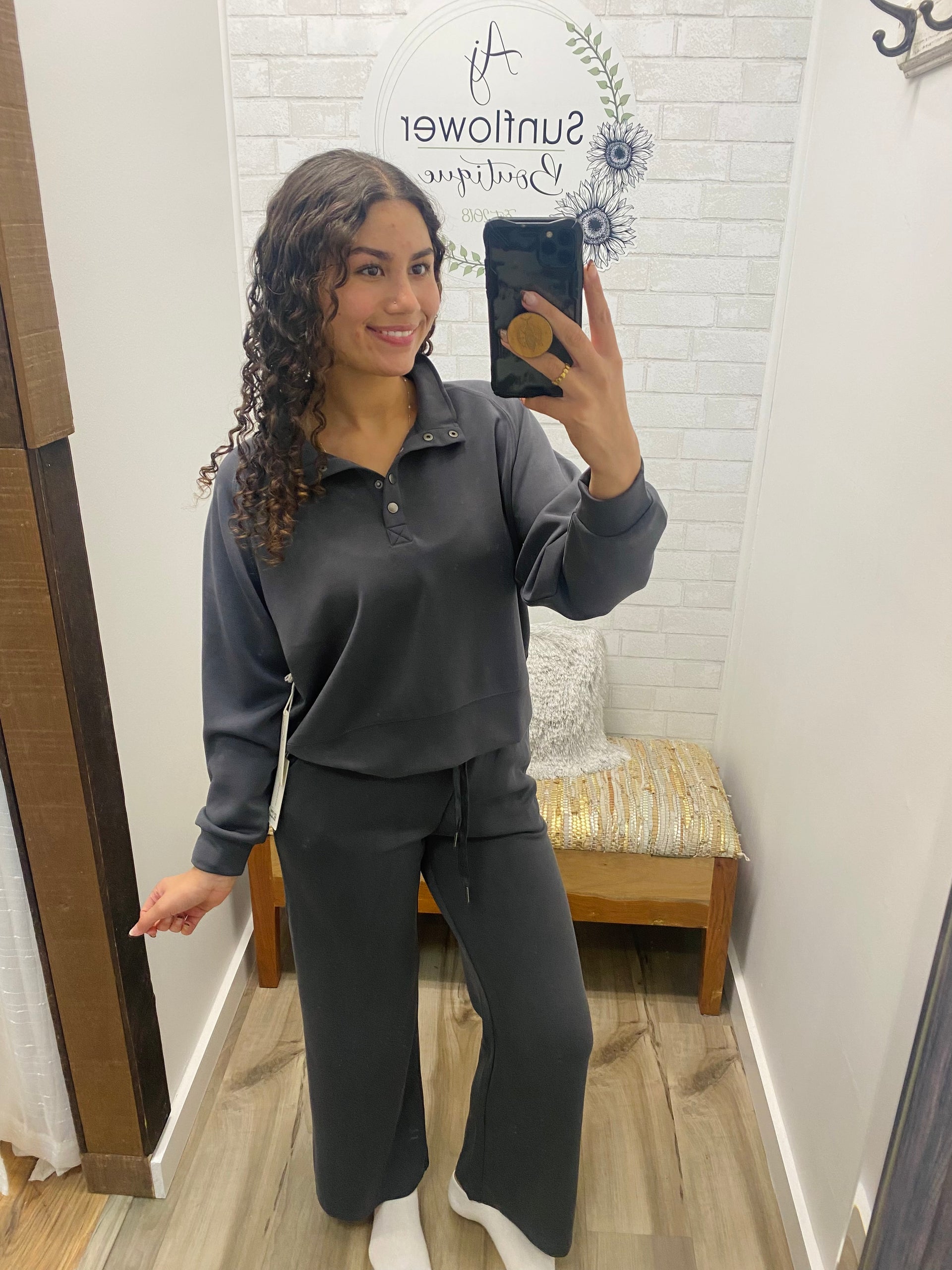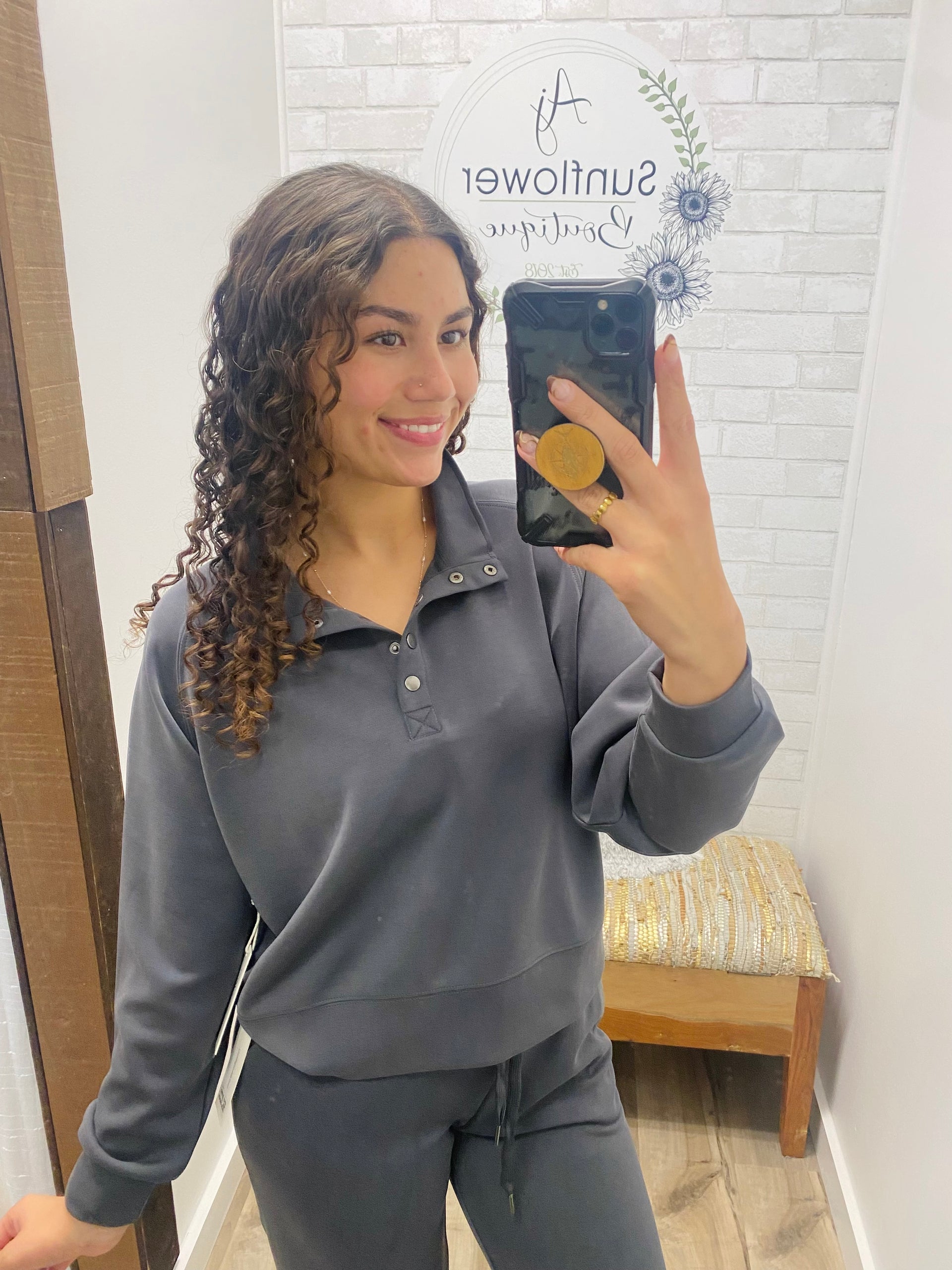 A soft, slouchy henley with a slightly boxy fit and drop shoulders for that effortless “I just look like this” vibe. Lightweight but warm — the kind of top you throw on with everything.