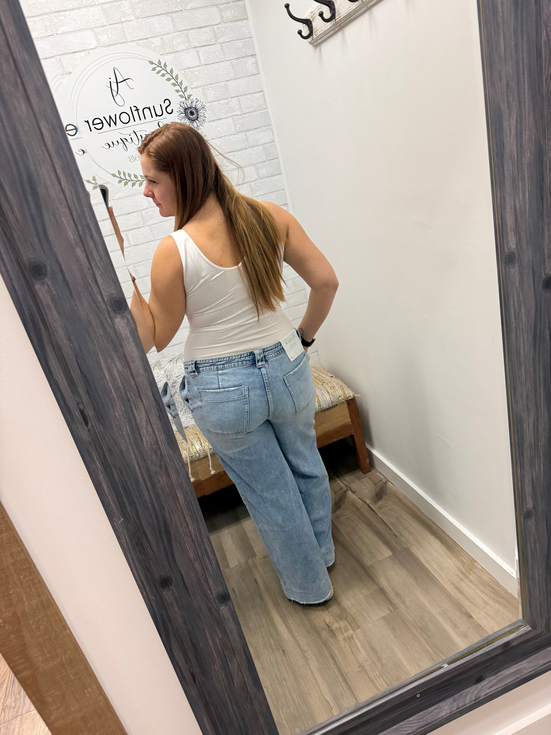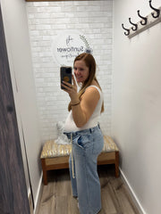 Meet the jeans you’ll live in when comfort is non-negotiable but you still want to look put together. The Easygoing Wide Leg Trouser Jean is soft, flattering, and effortlessly cool — featuring a high-rise fit, relaxed wide leg, and a comfy drawstring waist that gives you that polished-meets-laid-back feel.