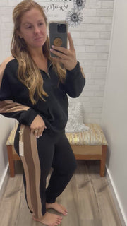 This half-zip pullover by Vintage Havana brings all the fall feels with warm maple-toned accents down the sleeves and shoulders. The roomy fit and kangaroo pocket make it an easy throw-on for pumpkin patch days or dog walks through crunchy leaves. Pair it with the matching joggers or layer over a long tee and leggings for your go-to cozy combo.
