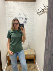 Katie typically wears medium in women's clothing and is wearing a medium in this photo