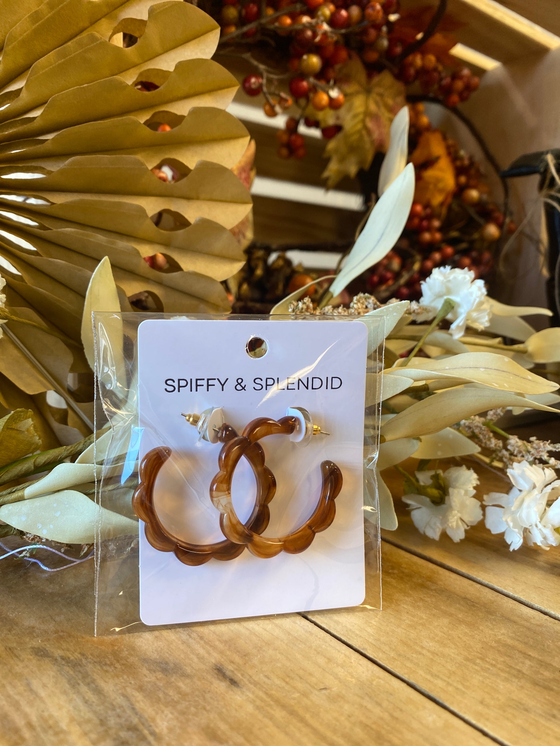 Bold, Playful, and Utterly Chic Our Scarlet Hoops are here to turn heads—in the prettiest way possible. Made from glossy resin and shaped in a unique scalloped silhouette, these hoops bring a modern twist to a classic shape. The rich amber hue adds a pop of color that’s equal parts bold and wearable. Lightweight enough for everyday, yet striking enough for special occasions—these beauties are a go-to for dressing up jeans and a tee or adding polish to a night-out look.